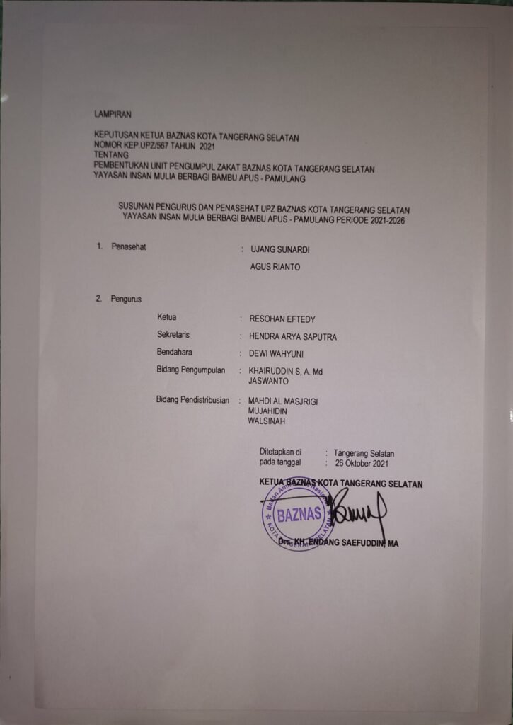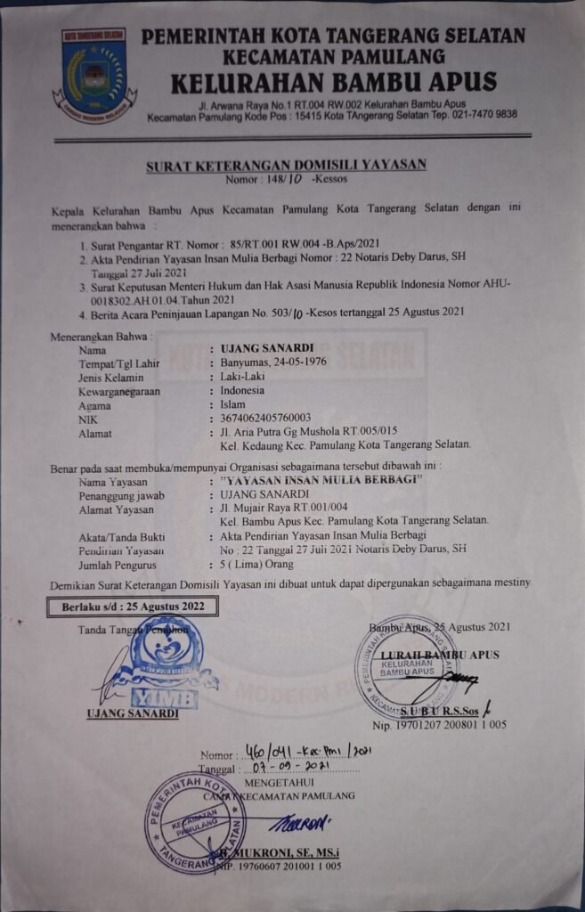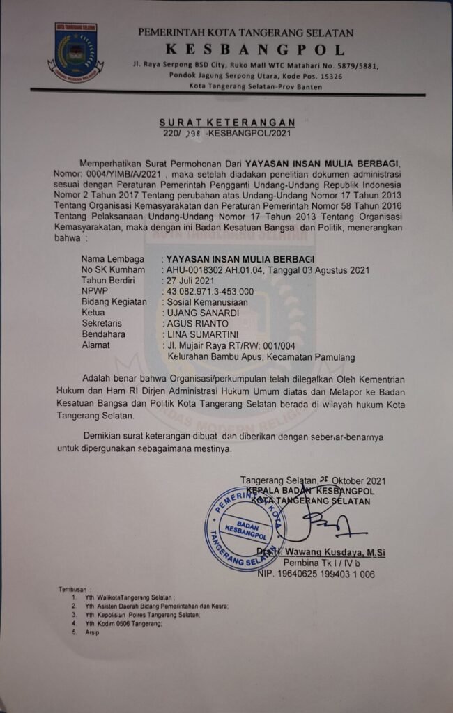 Artikel Kegiatan Lain Lain Alhamdulillah YIMB Kini Telah Resmi Menjadi UPZ BAZNAS,Telah Dilengkapi SKT Dari Kesbangpol,NIB Dan Tanda Daftar Yayasan/ORSOS Dari DINSOS Kota Tangerang Selatan Imbfoundation Oktober 26, 2021 Post navigation Previous Alhamdulillah Kebahagiaan Adik-adik Yatim Dhuafa YIMB Kembali Terpancar Dari Senyum CerianyaNext Begini Sejarah Asli Dan Bunyi Sumpah Pemuda Tinggalkan Balasan Batalkan balasanAlamat email Anda tidak akan dipublikasikan. Ruas yang wajib ditandai *Komentar * Nama * Email * Situs Web Simpan nama, email, dan situs web saya pada peramban ini untuk komentar saya berikutnya. More Stories 2 min read Keagamaan Kegiatan Lain Lain Kemanusiaan Qurban Santunan YIMB peduli membagikan paket daging qurban kepada anak yatim,dhuafa,lansia,dan masyarakat sekitar | 30 Juni 2023 Juli 2, 2023 Admin YIMB 1 min read Artikel Hari Besar Keagamaan Kemanusiaan Pendidikan Qurban Ramadhan Santunan Sosial Titipan Do'a Wakaf Zakat Santunan Rutin dan Istighosah Bersama Adik-adik Yatim Dhuafa Yayasan Insan Mulia Berbagi 16/06/2023 Juni 27, 2023 Imbfoundation 1 min read Artikel Keagamaan Kemanusiaan Qurban Ramadhan Santunan Sosial Titipan Do'a Mengawali Doa Bersama DiBulan Juni 09/06/2023 Juni 27, 2023 Imbfoundation