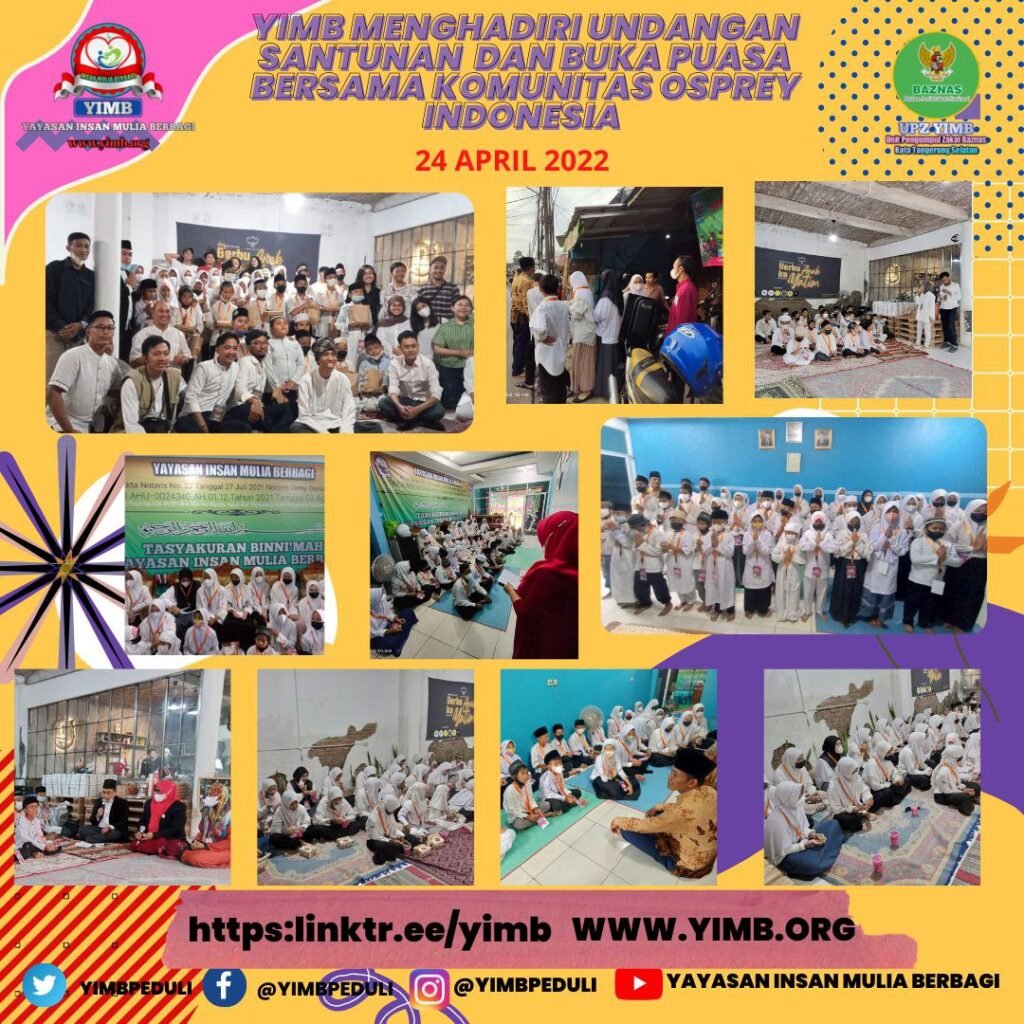 Menghadiri Undangan santunan Dan Bukapuasa Bersama Komunitas Osprey Indonesia Minggu, 24 April 2022 *اَلسَّلاَمُ عَلَيْكُمْ وَرَحْمَةُ الَّلهِ وَبَرَكَاتُه* *بِسْــــــــــــــــــــــمِ اللّهِ الرَّحْمَنِ الرَّحِيْم* *اللَّهُمَّ إِنِّي أَسْأَلُكَ عِلْمًا نَافِعًا، وَرِزْقًا طَيِّبًا، وَعَمَلًا مُتَقَبَّلً* _*Yaa Allah*…._ _*Sesungguhnya kami memohon kepada-MU ilmu yang bermanfaat, rizqi yang halal, dan amal yang diterima.”*🤲_ *ربنا اتنا في الدنيا حسنة وفي الاخرة حسنة و قنا عذاب النار* *آمين.. آمين.. آمين يَآرَبْ العالمين* 🤲 Alhamdulillah…. Barakallah 🤲🤲🤲 Acara Santunan dan Buka Puasa Bersama dari Komunitas Osprey Indonesia pada hari Minggu 24 April 2022 di cafe Hakiki Cluster Berjalan Dengan Baik Dan Lancar. Terima Kasih Untuk Shohibul Yatim Sahabat Berbagi YIMB Yang Telah Meng-Amanahkan Sedikit Rizkinya Untuk Berbagi Kebahagiaan Dengan Adik adik Yatim Dhuafa Binaan YIMB 🙏🙏🙏 https://sahabatberbagi.com https://linktr.ee/yimb Rekening Donasi Bank BRI No.1127-01-001023-56-9 A/n Yayasan Insan Mulia Berbagi Telpon : 021-74784627