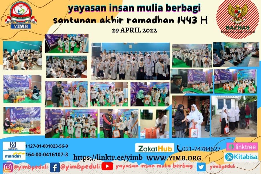 Kegiatan Adik-adik Binaan YIMB Selama Bulan Ramadhan 1443H/2022 Alhamdulillah Tidak Terasa Telah berakhirnya Bulan Ramadhan ini,cepat sekali bukan? Beberapa Kegiatan selama bulan Ramadhan • TPQ Harian Insan Mulia • Berbuka Puasa Bersama • Tadarus Al-Qur’an • Pesantren kilat • Menghadiri Undangan Santunan • Santunan Akhir Ramadhan Sekecil apapun itu pahala akan Allah lipat gandakan dibulan ini,Jadi Pahala baik apa saja yang telah diperbuat selama bulan Ramadhan? Jangan lupa untuk selalu menyisihkan harta kita untuk adik yatim-piatu dan dhuafa ya,,, Teruntuk Para Donatur Terima Kasih Untuk Shohibul Yatim Sahabat Berbagi YIMB Yang Telah Meng-Amanahkan Sedikit Rizkinya Untuk Berbagi Kebahagiaan Dengan Adik adik Yatim Dhuafa Binaan YIMB 🙏🙏🙏 Kami Segenap Civitas Yayasan Insan Mulia Berbagi Mengucapkan Minal aidzin walfaidzin Mohon Maaf Lahir Dan Batin 🙏🙏 https://sahabatberbagi.com https://linktr.ee/yimb Rekening Donasi Bank BRI No.1127-01-001023-56-9 Bank Mandiri 164-00-0416107-3 A/n Yayasan Insan Mulia Berbagi Telpon : 021-74784627