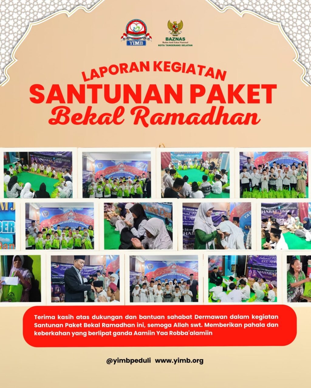Alhamdulillah telah kami implementasikan titipan amanah zakat yang telah diberikan dalam kegiatan pemeberian Santunan Paket Bekal Ramadhan YIMB, untuk Anak-anak Yatim,Dhuafa dan Lansia. Dalam bentuk pemberian Uang Tunai dan Paket Sembako persiapan awal Ramadhan.